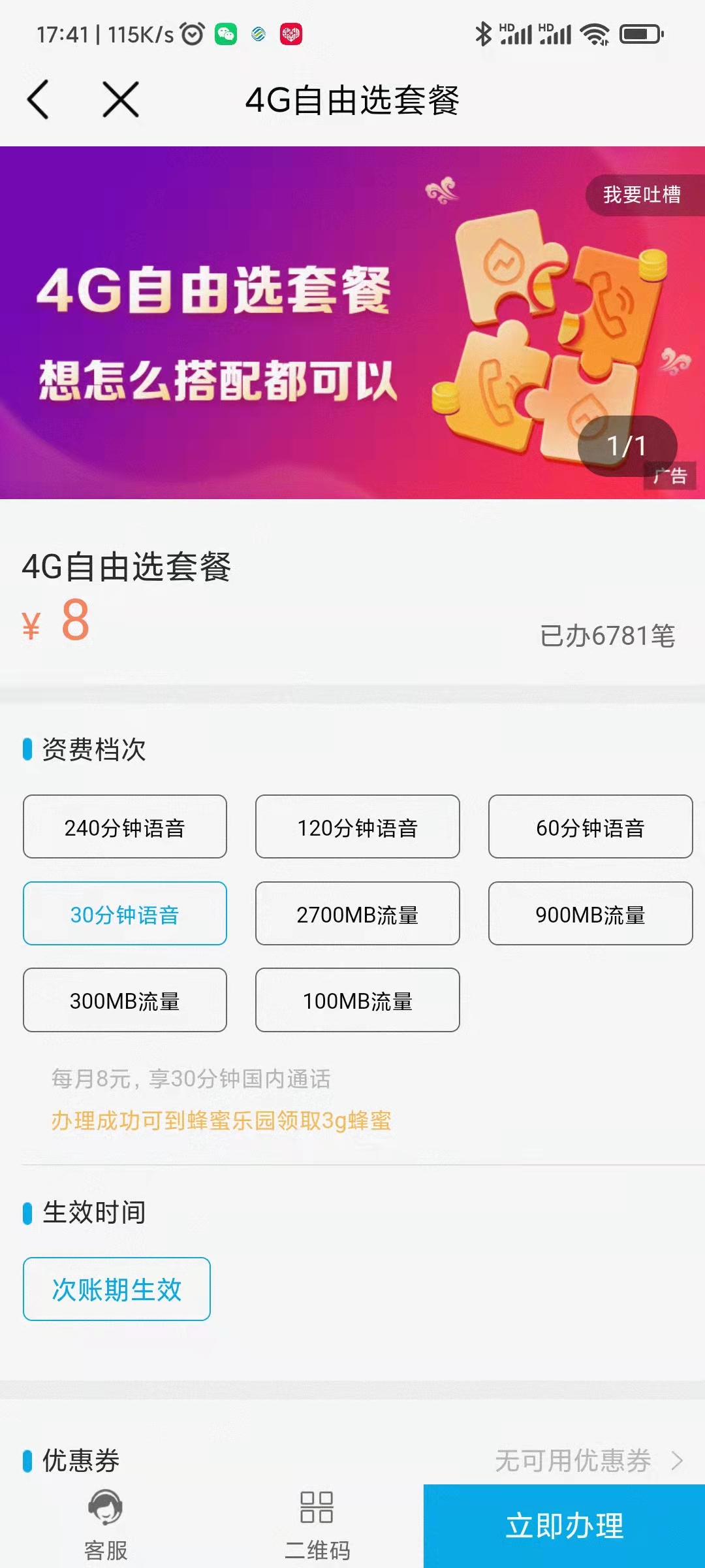 1、各个地方不同,有的地方这个套餐还没有下架,直接app上面就可以选择。