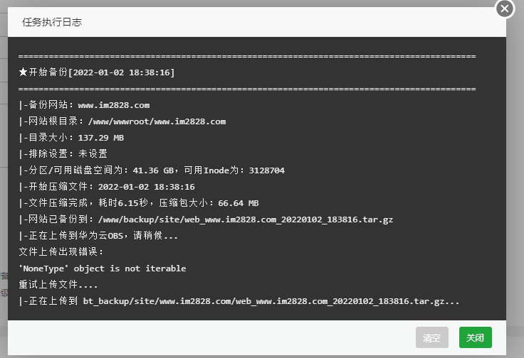 3、执行之后,可以点击日志,看备份的过程。自动任务完成以后,在华为云存储的后台查看是否有备份文件备份成功。