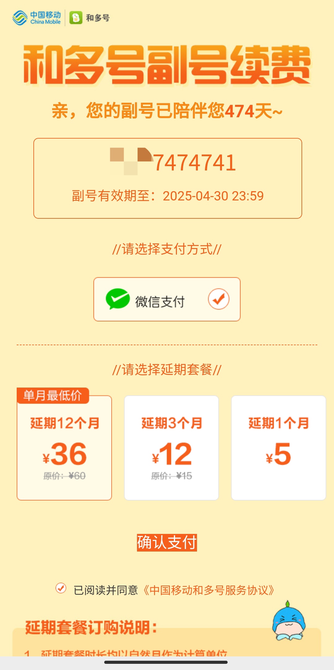 【和多号到期提醒】尊敬的客户:您的副号13xxxxxxxxx年包套餐将于2022年2月底到期。现回复如下指令:XD1续订5元包月;XDQ1续订36元年包,已续订无需理会。温馨提示:1、未在2月28日(含)前续订,到期自动取消副号。2、续订成功后将立即生效,套餐不可变更。3、如需尝试找回销户副号码,可登录和多号App-我的-副号找回进行查询。4、如副号有绑定网站/应用的账号,建议保留副号。【中国移动 和多号】