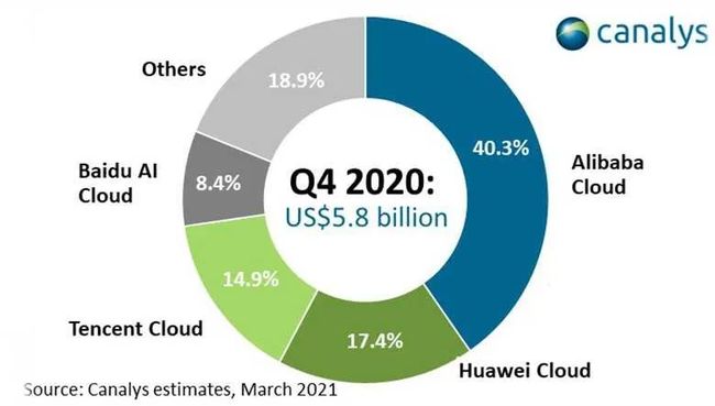 依次排名为:亚马逊(40.8%)、微软(19.7%)、阿里巴巴(9.5%)、谷歌(6.1%)、 华为(4.2%)、腾讯(未知)。