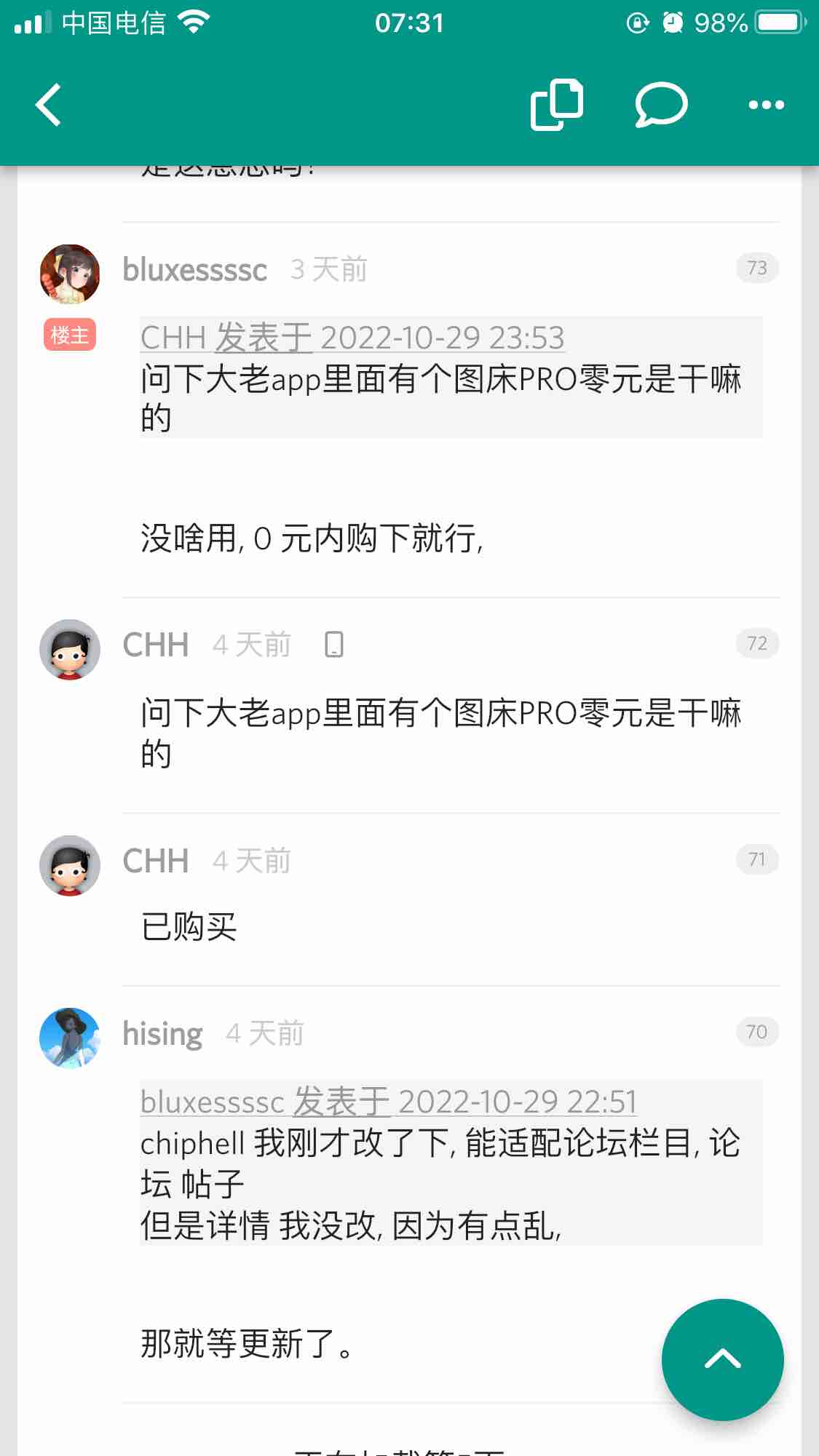 这次更新之后(1.3.0)搞了个pro出来,说是0元买pro 。如果不买这个0元的内购pro功能,对不起看帖都看不了。会疯狂跳转喊你内购0元的pro功能是去广告和有高清图床……(我一脸问号,广告本来就没有。图床本来就有的功能。app是已经付费过了。还是原价买的)