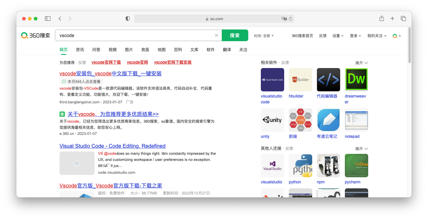 那个mjj说各大搜索都有广告,但是我这边百度必应搜vscode第一页都没有。 ...