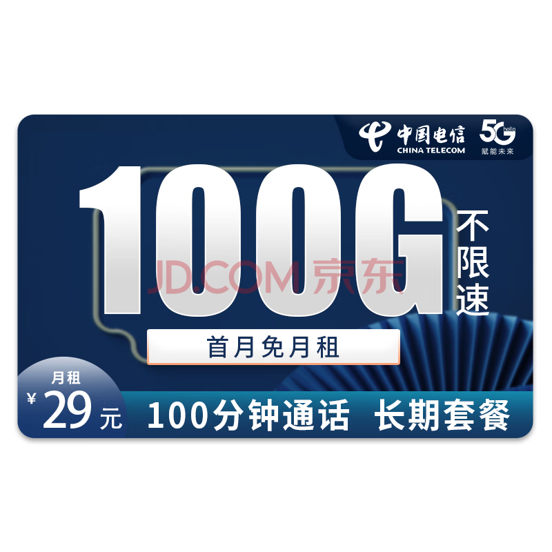 中国电信 5G白雪卡-29元100G流量+100分钟+长期20年套餐