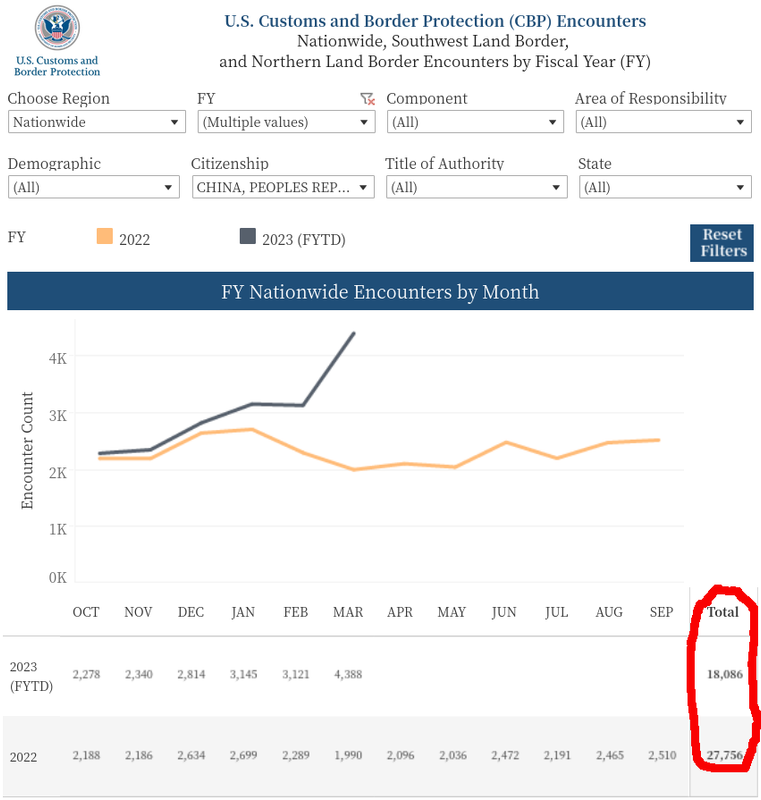 可惜与CBP发布的数据依然是相差巨大,根据美国CBP公布数据表,2022财年(10月-9月),中国公民被CBP边境执法27756次, 2023财年(10月-3月),中国公民被CBP边境执法18086次。引用数据来自https://www.cbp.gov/newsroom/stats/nationwide-encounters