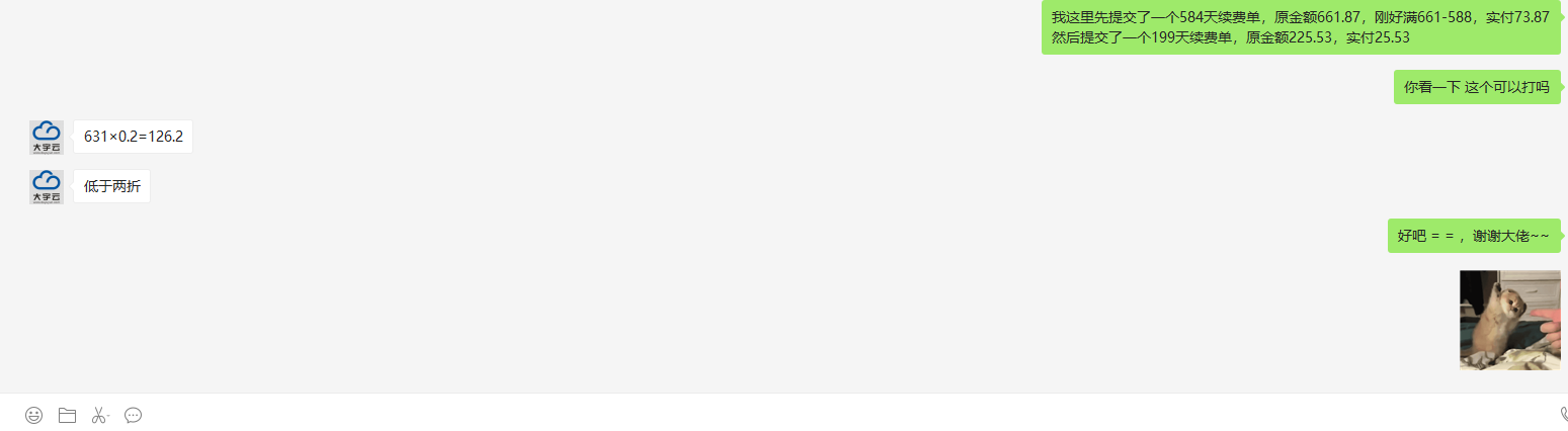 如果用完券,低于二折就没法儿打折,给我算完,说低于二折,我还说了,没有黑大宇云的意思,解释过了还要再开个贴说我胡说?聊天记录我一句没删。 .