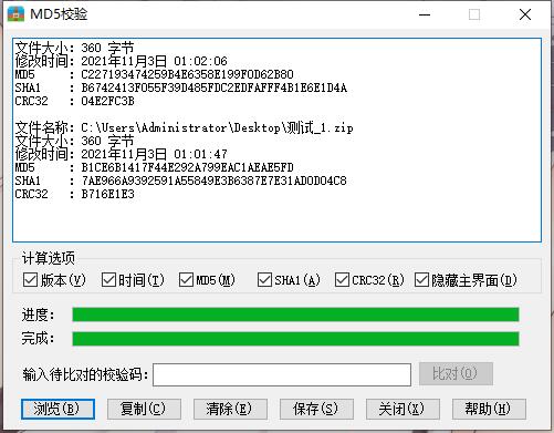 请看案例,一个RAR文件,压缩了两次,时间戳是不一样的,一个23秒一个39秒,MD5缺是一样的,所以这里MD5只会验证文件内容,不会对时间戳进行MD5验证,懂?