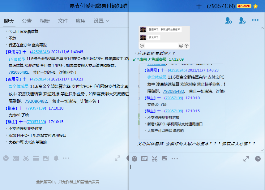 现在我客户一直纠缠我,认为是我黑我客户的钱呢,我现在有苦说不出。他随便找个借口,说警察找他了。他当天下午就演戏说去警局说明一下情况,还说把我资料都提交上去了。让我等着JC电话就行了。还给他商户们说我搞诈骗的。我骗的钱都在你手里,我落个诈骗的名誉?我这等了两三天了。也没人给我打电话啊。私聊给他各种号发了很多消息一直不回我。然后今天夜里还在他通知群里发公告说给所有商户结算完成。