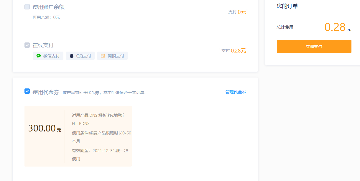 这张300元的 DNS专业版续费券。。续费DNS的话 一年是 188元,二年 376